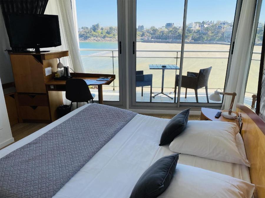 The hotel stands out for its modern design and comfortable rooms, equipped with everything necessary for a pleasant stay: flat-screen satellite TV, minibar, and, in some cases, a kitchenette. The experience is enhanced by breathtaking views of Pointe du Moulinet and Saint-Malo, offered by several rooms and suites, some of which even feature a balcony.